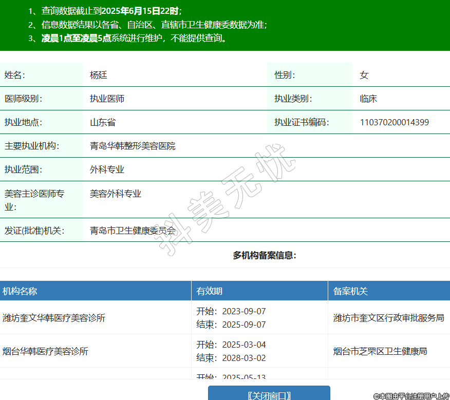姓名:楊廷性別:女醫(yī)師級別:執(zhí)業(yè)醫(yī)師執(zhí)業(yè)類別:臨床執(zhí)業(yè)地點:山東省執(zhí)業(yè)證書編碼:110370200014399主要執(zhí)業(yè)機構:青島華韓整形美容醫(yī)院執(zhí)業(yè)范圍:外科專業(yè)美容主診醫(yī)師專業(yè):美容外科專業(yè)發(fā)證(批準)機關:青島市衛(wèi)生健康委員會多機構備案信息: -