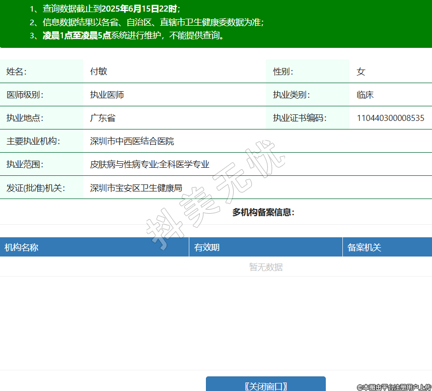 姓名:付敏性別:女醫(yī)師級(jí)別:執(zhí)業(yè)醫(yī)師執(zhí)業(yè)類別:臨床執(zhí)業(yè)地點(diǎn):廣東省執(zhí)業(yè)證書編碼:110440300008535主要執(zhí)業(yè)機(jī)構(gòu):深圳市中西醫(yī)結(jié)合醫(yī)院執(zhí)業(yè)范圍:皮膚病與性病專業(yè);全科醫(yī)學(xué)專業(yè)發(fā)證(批準(zhǔn))機(jī)關(guān):深圳市寶安區(qū)衛(wèi)生健康局 -