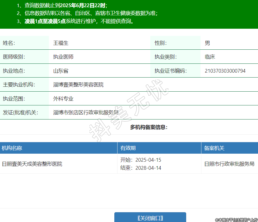 姓名:王福生性別:男醫(yī)師級別:執(zhí)業(yè)醫(yī)師執(zhí)業(yè)類別:臨床執(zhí)業(yè)地點:山東省執(zhí)業(yè)證書編碼:210370303000794主要執(zhí)業(yè)機構:淄博壹美整形美容醫(yī)院執(zhí)業(yè)范圍:外科專業(yè)發(fā)證(批準)機關:淄博市張店區(qū)行政審批服務局多機構備案信息:機構名稱 有效期 備案機關 日照壹美天成美容整形醫(yī)院 開始:2025-04-15結束:2028-04-14日照市行政審批服務局 -