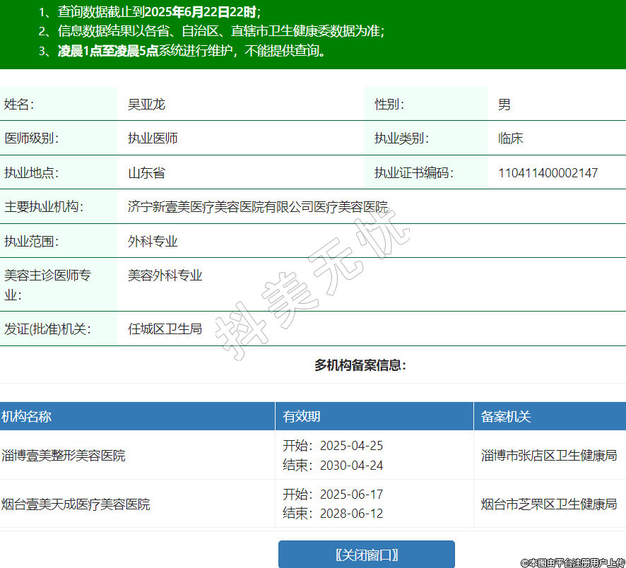 姓名:吳亞龍性別:男醫(yī)師級別:執(zhí)業(yè)醫(yī)師執(zhí)業(yè)類別:臨床執(zhí)業(yè)地點:山東省執(zhí)業(yè)證書編碼:110411400002147主要執(zhí)業(yè)機(jī)構(gòu):濟(jì)寧新壹美醫(yī)療美容醫(yī)院有限公司醫(yī)療美容醫(yī)院執(zhí)業(yè)范圍:外科專業(yè)美容主診醫(yī)師專業(yè):美容外科專業(yè)發(fā)證(批準(zhǔn))機(jī)關(guān):任城區(qū)衛(wèi)生局多機(jī)構(gòu)備案信息:機(jī)構(gòu)名稱 有效期 備案機(jī)關(guān) 淄博壹美整形美容醫(yī)院 開始:2025-04-25結(jié)束:2030-04-24淄博市張店區(qū)衛(wèi)生健康局 煙臺壹美天成醫(yī)療美容醫(yī)院 開始:2025-06-17結(jié)束:2028-06-12煙臺市芝罘區(qū)衛(wèi)生健康局 -
