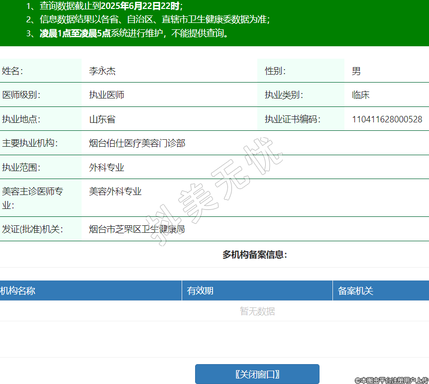 姓名:李永杰性別:男醫(yī)師級別:執(zhí)業(yè)醫(yī)師執(zhí)業(yè)類別:臨床執(zhí)業(yè)地點:山東省執(zhí)業(yè)證書編碼:110411628000528主要執(zhí)業(yè)機(jī)構(gòu):煙臺伯仕醫(yī)療美容門診部執(zhí)業(yè)范圍:外科專業(yè)美容主診醫(yī)師專業(yè):美容外科專業(yè)發(fā)證(批準(zhǔn))機(jī)關(guān):煙臺市芝罘區(qū)衛(wèi)生健康局 -