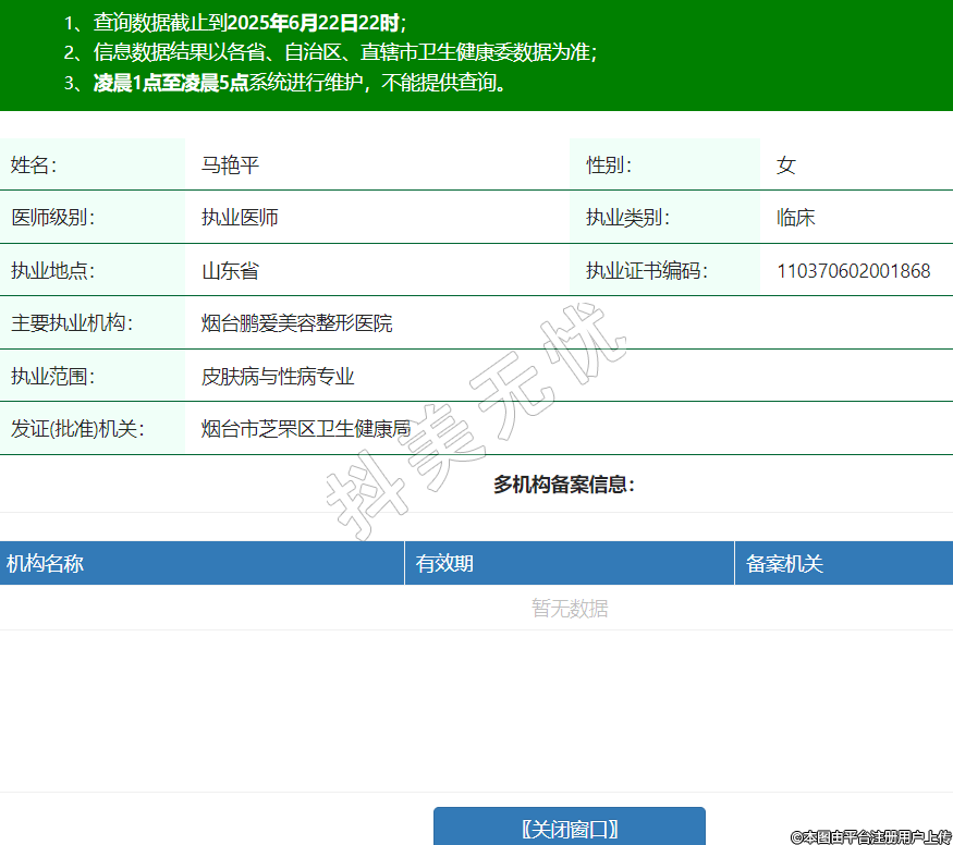 姓名:馬艷平性別:女醫(yī)師級別:執(zhí)業(yè)醫(yī)師執(zhí)業(yè)類別:臨床執(zhí)業(yè)地點(diǎn):山東省執(zhí)業(yè)證書編碼:110370602001868主要執(zhí)業(yè)機(jī)構(gòu):煙臺鵬愛美容整形醫(yī)院執(zhí)業(yè)范圍:皮膚病與性病專業(yè)發(fā)證(批準(zhǔn))機(jī)關(guān):煙臺市芝罘區(qū)衛(wèi)生健康局 -