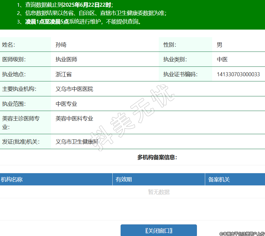 姓名:孫琦性別:男醫(yī)師級別:執(zhí)業(yè)醫(yī)師執(zhí)業(yè)類別:中醫(yī)執(zhí)業(yè)地點(diǎn):浙江省執(zhí)業(yè)證書編碼:141330703000033主要執(zhí)業(yè)機(jī)構(gòu):義烏市中醫(yī)醫(yī)院執(zhí)業(yè)范圍:中醫(yī)專業(yè)美容主診醫(yī)師專業(yè):美容中醫(yī)科專業(yè)發(fā)證(批準(zhǔn))機(jī)關(guān):義烏市衛(wèi)生健康局 -