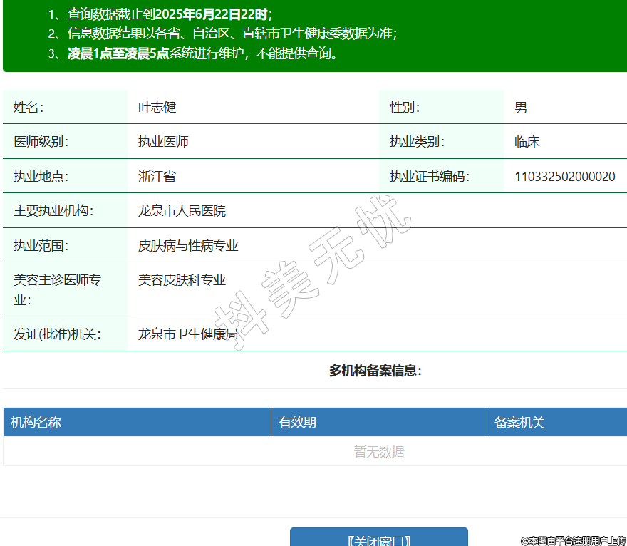 姓名:葉志健性別:男醫(yī)師級(jí)別:執(zhí)業(yè)醫(yī)師執(zhí)業(yè)類別:臨床執(zhí)業(yè)地點(diǎn):浙江省執(zhí)業(yè)證書編碼:110332502000020主要執(zhí)業(yè)機(jī)構(gòu):龍泉市人民醫(yī)院執(zhí)業(yè)范圍:皮膚病與性病專業(yè)美容主診醫(yī)師專業(yè):美容皮膚科專業(yè)發(fā)證(批準(zhǔn))機(jī)關(guān):龍泉市衛(wèi)生健康局 -