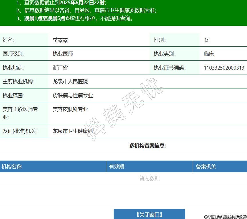 姓名:季露露性別:女醫(yī)師級(jí)別:執(zhí)業(yè)醫(yī)師執(zhí)業(yè)類別:臨床執(zhí)業(yè)地點(diǎn):浙江省執(zhí)業(yè)證書編碼:110332502000313主要執(zhí)業(yè)機(jī)構(gòu):龍泉市人民醫(yī)院執(zhí)業(yè)范圍:皮膚病與性病專業(yè)美容主診醫(yī)師專業(yè):美容皮膚科專業(yè)發(fā)證(批準(zhǔn))機(jī)關(guān):龍泉市衛(wèi)生健康局 -