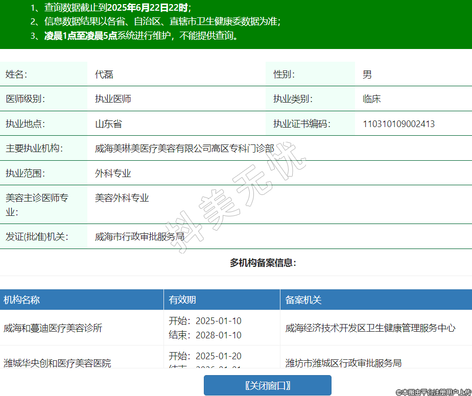姓名:代磊性別:男醫(yī)師級別:執(zhí)業(yè)醫(yī)師執(zhí)業(yè)類別:臨床執(zhí)業(yè)地點:山東省執(zhí)業(yè)證書編碼:110310109002413主要執(zhí)業(yè)機構(gòu):威海美琳美醫(yī)療美容有限公司高區(qū)??崎T診部執(zhí)業(yè)范圍:外科專業(yè)美容主診醫(yī)師專業(yè):美容外科專業(yè)發(fā)證(批準)機關:威海市行政審批服務局多機構(gòu)備案信息:機構(gòu)名稱 有效期 備案機關 威海和蔓迪醫(yī)療美容診所 開始:2025-01-10結(jié)束:2028-01-10威海經(jīng)濟技術開發(fā)區(qū)衛(wèi)生健康管理服務中心 濰城華央創(chuàng)和醫(yī)療美容醫(yī)院 開始:2025-01-20結(jié)束:2026-01-01濰坊市濰城區(qū)行政審批服務局 威海仙美醫(yī)療美容診所 開始:2025-03-15結(jié)束:2028-03-15威?;鹁娓呒夹g產(chǎn)業(yè)開發(fā)區(qū)社會事業(yè)務局 -