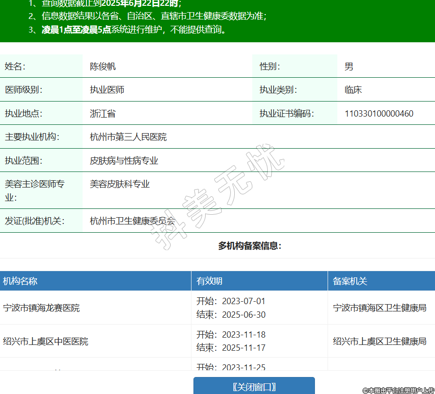 姓名:陳俊帆性別:男醫(yī)師級(jí)別:執(zhí)業(yè)醫(yī)師執(zhí)業(yè)類別:臨床執(zhí)業(yè)地點(diǎn):浙江省執(zhí)業(yè)證書編碼:110330100000460主要執(zhí)業(yè)機(jī)構(gòu):杭州市第三人民醫(yī)院執(zhí)業(yè)范圍:皮膚病與性病專業(yè)美容主診醫(yī)師專業(yè):美容皮膚科專業(yè)發(fā)證(批準(zhǔn))機(jī)關(guān):杭州市衛(wèi)生健康委員會(huì)多機(jī)構(gòu)備案信息:機(jī)構(gòu)名稱 有效期 備案機(jī)關(guān) 寧波市鎮(zhèn)海龍賽醫(yī)院 開始:2023-07-01結(jié)束:2025-06-30寧波市鎮(zhèn)海區(qū)衛(wèi)生健康局 紹興市上虞區(qū)中醫(yī)醫(yī)院 開始:2023-11-18結(jié)束:2025-11-17紹興市上虞區(qū)衛(wèi)生健康局 杭州市蕭山區(qū)第二人民醫(yī)院 開始:2023-11-25結(jié)束:2028-11-24杭州市蕭山區(qū)衛(wèi)生健康局 新昌縣中醫(yī)院 開始:2023-12-15結(jié)束:2026-12-01新昌縣衛(wèi)生健康局 永康市第一人民醫(yī)院 開始:2024-01-01結(jié)束:2025-12-31永康市衛(wèi)生健康局 杭州市臨平區(qū)中醫(yī)院 開始:2025-02-13結(jié)束:2025-12-31杭州市臨平區(qū)衛(wèi)生健康局 -