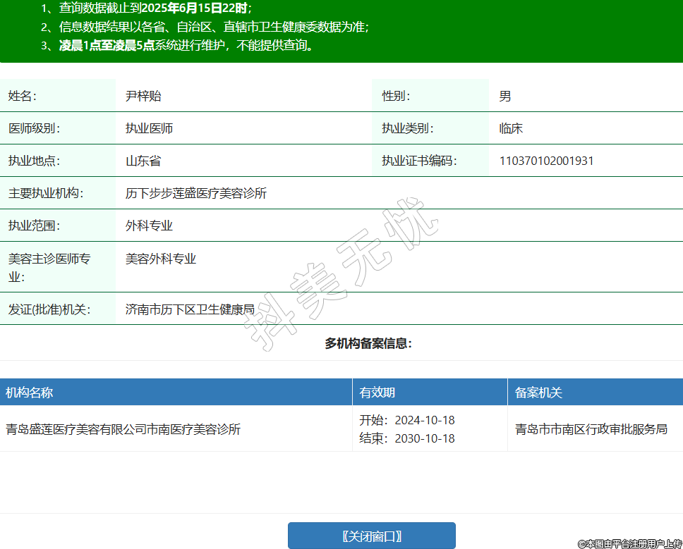 姓名:尹梓貽性別:男醫(yī)師級(jí)別:執(zhí)業(yè)醫(yī)師執(zhí)業(yè)類(lèi)別:臨床執(zhí)業(yè)地點(diǎn):山東省執(zhí)業(yè)證書(shū)編碼:110370102001931主要執(zhí)業(yè)機(jī)構(gòu):歷下步步蓮盛醫(yī)療美容診所執(zhí)業(yè)范圍:外科專(zhuān)業(yè)美容主診醫(yī)師專(zhuān)業(yè):美容外科專(zhuān)業(yè)發(fā)證(批準(zhǔn))機(jī)關(guān):濟(jì)南市歷下區(qū)衛(wèi)生健康局多機(jī)構(gòu)備案信息:機(jī)構(gòu)名稱(chēng) 有效期 備案機(jī)關(guān) 青島盛蓮醫(yī)療美容有限公司市南醫(yī)療美容診所 開(kāi)始:2024-10-18結(jié)束:2030-10-18青島市市南區(qū)行政審批服務(wù)局 -