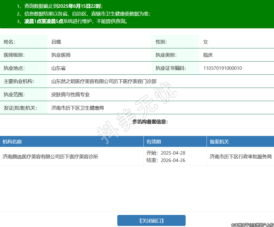 姓名:呂璐性別:女醫(yī)師級(jí)別:執(zhí)業(yè)醫(yī)師執(zhí)業(yè)類別:臨床執(zhí)業(yè)地點(diǎn):山東省執(zhí)業(yè)證書編碼:110370191000010主要執(zhí)業(yè)機(jī)構(gòu):山東然之鑰醫(yī)療美容有限公司歷下醫(yī)療美容門診部執(zhí)業(yè)范圍:皮膚病與性病專業(yè)發(fā)證(批準(zhǔn))機(jī)關(guān):濟(jì)南市歷下區(qū)衛(wèi)生健康局多機(jī)構(gòu)備案信息:機(jī)構(gòu)名稱 有效期 備案機(jī)關(guān) 濟(jì)南顏選醫(yī)療美容有限公司歷下醫(yī)療美容診所 開始:2025-04-28結(jié)束:2026-04-26濟(jì)南市歷下區(qū)行政審批服務(wù)局 -