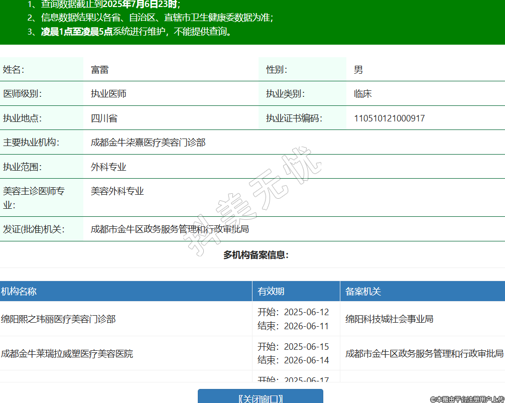 姓名:富雷性別:男醫(yī)師級(jí)別:執(zhí)業(yè)醫(yī)師執(zhí)業(yè)類別:臨床執(zhí)業(yè)地點(diǎn):四川省執(zhí)業(yè)證書(shū)編碼:110510121000917主要執(zhí)業(yè)機(jī)構(gòu):成都金牛柒熹醫(yī)療美容門(mén)診部執(zhí)業(yè)范圍:外科專業(yè)美容主診醫(yī)師專業(yè):美容外科專業(yè)發(fā)證(批準(zhǔn))機(jī)關(guān):成都市金牛區(qū)政務(wù)服務(wù)管理和行政審批局多機(jī)構(gòu)備案信息:機(jī)構(gòu)名稱 有效期 備案機(jī)關(guān) 綿陽(yáng)熙之瑋麗醫(yī)療美容門(mén)診部 開(kāi)始:2025-06-12結(jié)束:2026-06-11綿陽(yáng)科技城社會(huì)事業(yè)局 成都金牛萊瑞拉威塑醫(yī)療美容醫(yī)院 開(kāi)始:2025-06-15結(jié)束:2026-06-14成都市金牛區(qū)政務(wù)服務(wù)管理和行政審批局 成都晶都醫(yī)療美容醫(yī)院有限公司府青路二段醫(yī)療美容門(mén)診部 開(kāi)始:2025-06-17結(jié)束:2026-06-16成都市成華區(qū)行政審批局 成都高新高鑫醫(yī)療美容門(mén)診部 開(kāi)始:2025-06-18結(jié)束:2026-06-17成都高新技術(shù)產(chǎn)業(yè)開(kāi)發(fā)區(qū)衛(wèi)生健康局 成都錦江艾瑞瑪醫(yī)療美容門(mén)診部 開(kāi)始:2025-07-02結(jié)束:2026-07-01成都市錦江區(qū)行政審批局 -