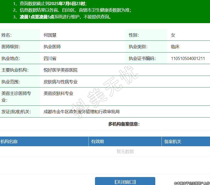 姓名:何國慧性別:女醫(yī)師級別:執(zhí)業(yè)醫(yī)師執(zhí)業(yè)類別:臨床執(zhí)業(yè)地點:四川省執(zhí)業(yè)證書編碼:110510504001211主要執(zhí)業(yè)機構(gòu):悅好醫(yī)學美容醫(yī)院執(zhí)業(yè)范圍:皮膚病與性病專業(yè)美容主診醫(yī)師專業(yè):美容皮膚科專業(yè)發(fā)證(批準)機關(guān):成都市金牛區(qū)政務(wù)服務(wù)管理和行政審批局 -
