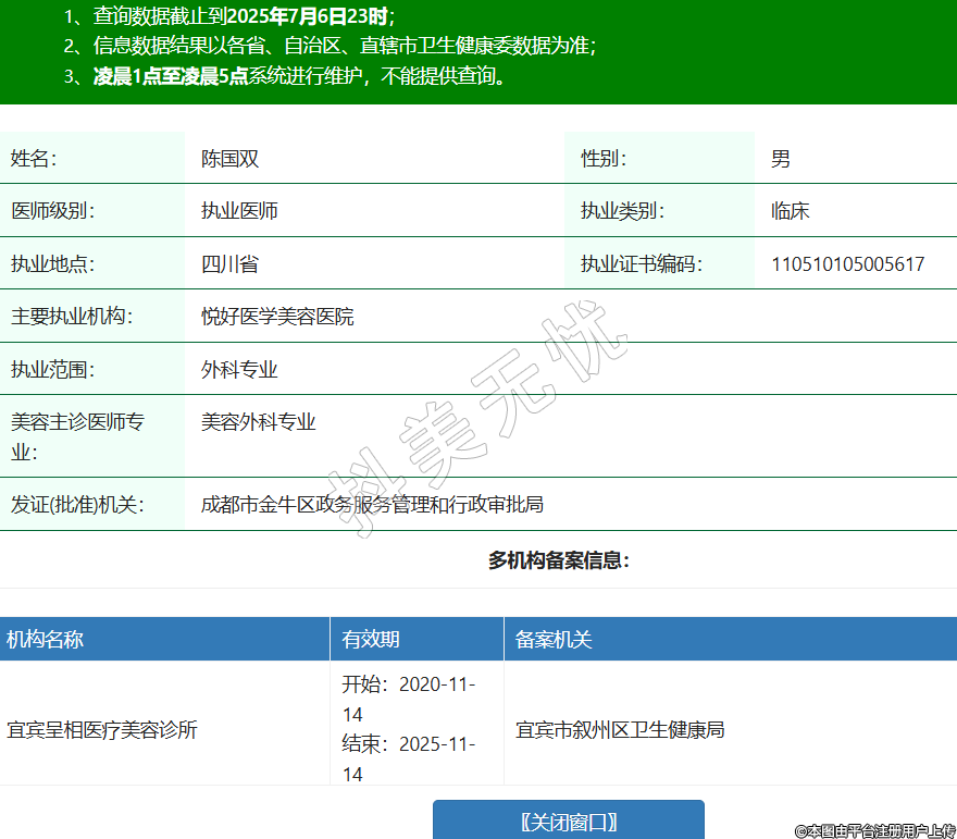 姓名:陳國雙性別:男醫(yī)師級別:執(zhí)業(yè)醫(yī)師執(zhí)業(yè)類別:臨床執(zhí)業(yè)地點(diǎn):四川省執(zhí)業(yè)證書編碼:110510105005617主要執(zhí)業(yè)機(jī)構(gòu):悅好醫(yī)學(xué)美容醫(yī)院執(zhí)業(yè)范圍:外科專業(yè)美容主診醫(yī)師專業(yè):美容外科專業(yè)發(fā)證(批準(zhǔn))機(jī)關(guān):成都市金牛區(qū)政務(wù)服務(wù)管理和行政審批局多機(jī)構(gòu)備案信息:機(jī)構(gòu)名稱 有效期 備案機(jī)關(guān) 宜賓呈相醫(yī)療美容診所 開始:2020-11-14結(jié)束:2025-11-14宜賓市敘州區(qū)衛(wèi)生健康局 成都青羊華人醫(yī)聯(lián)為美醫(yī)療美容門診部 開始:2023-07-08結(jié)束:2025-08-08成都市青羊區(qū)行政審批局(成都市青羊區(qū)政務(wù)服務(wù)管理和網(wǎng)絡(luò)理政辦公室) 成都高新維星顏醫(yī)療美容門診部 開始:2023-08-16結(jié)束:2025-08-15成都高新技術(shù)產(chǎn)業(yè)開發(fā)區(qū)衛(wèi)生健康局 成都錦欣婦產(chǎn)科醫(yī)院 開始:2023-09-09結(jié)束:2025-09-07成都市錦江區(qū)行政審批局 -