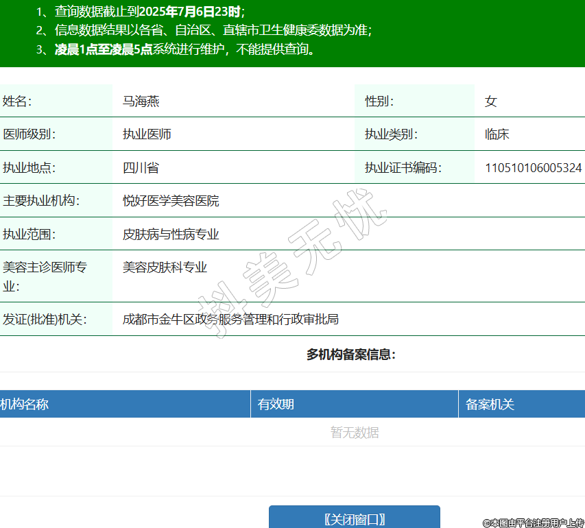 姓名:馬海燕性別:女醫(yī)師級別:執(zhí)業(yè)醫(yī)師執(zhí)業(yè)類別:臨床執(zhí)業(yè)地點:四川省執(zhí)業(yè)證書編碼:110510106005324主要執(zhí)業(yè)機(jī)構(gòu):悅好醫(yī)學(xué)美容醫(yī)院執(zhí)業(yè)范圍:皮膚病與性病專業(yè)美容主診醫(yī)師專業(yè):美容皮膚科專業(yè)發(fā)證(批準(zhǔn))機(jī)關(guān):成都市金牛區(qū)政務(wù)服務(wù)管理和行政審批局 -