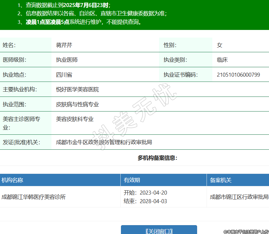 姓名:蔣芹芹性別:女醫(yī)師級別:執(zhí)業(yè)醫(yī)師執(zhí)業(yè)類別:臨床執(zhí)業(yè)地點(diǎn):四川省執(zhí)業(yè)證書編碼:210510106000799主要執(zhí)業(yè)機(jī)構(gòu):悅好醫(yī)學(xué)美容醫(yī)院執(zhí)業(yè)范圍:皮膚病與性病專業(yè)美容主診醫(yī)師專業(yè):美容皮膚科專業(yè)發(fā)證(批準(zhǔn))機(jī)關(guān):成都市金牛區(qū)政務(wù)服務(wù)管理和行政審批局多機(jī)構(gòu)備案信息:機(jī)構(gòu)名稱 有效期 備案機(jī)關(guān) 成都錦江華韓醫(yī)療美容診所 開始:2023-04-20結(jié)束:2028-04-03成都市錦江區(qū)行政審批局 -