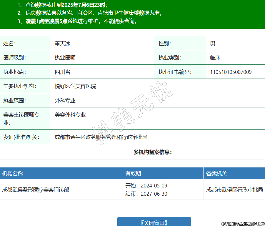 姓名:董天冰性別:男醫(yī)師級別:執(zhí)業(yè)醫(yī)師執(zhí)業(yè)類別:臨床執(zhí)業(yè)地點:四川省執(zhí)業(yè)證書編碼:110510105007009主要執(zhí)業(yè)機構:悅好醫(yī)學美容醫(yī)院執(zhí)業(yè)范圍:外科專業(yè)美容主診醫(yī)師專業(yè):美容外科專業(yè)發(fā)證(批準)機關:成都市金牛區(qū)政務服務管理和行政審批局多機構備案信息:機構名稱 有效期 備案機關 成都武侯圣形醫(yī)療美容門診部 開始:2024-05-09結束:2027-06-30成都市武侯區(qū)行政審批局 -
