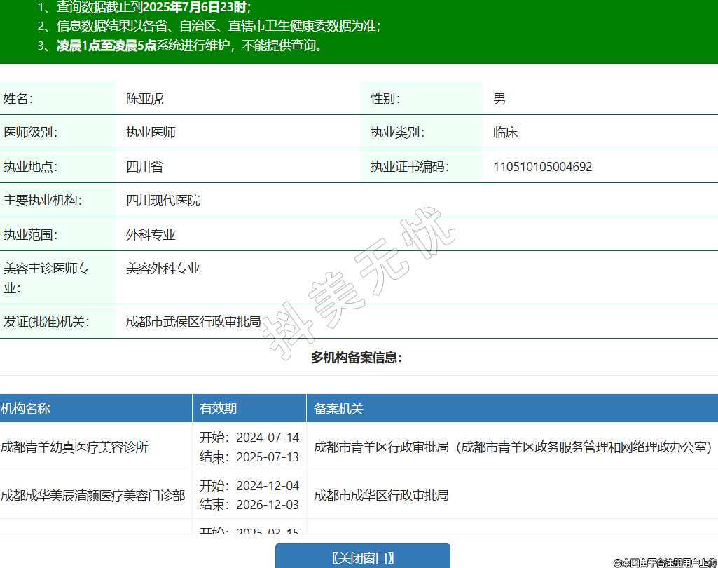 姓名:陳亞虎性別:男醫(yī)師級(jí)別:執(zhí)業(yè)醫(yī)師執(zhí)業(yè)類別:臨床執(zhí)業(yè)地點(diǎn):四川省執(zhí)業(yè)證書編碼:110510105004692主要執(zhí)業(yè)機(jī)構(gòu):四川現(xiàn)代醫(yī)院執(zhí)業(yè)范圍:外科專業(yè)美容主診醫(yī)師專業(yè):美容外科專業(yè)發(fā)證(批準(zhǔn))機(jī)關(guān):成都市武侯區(qū)行政審批局多機(jī)構(gòu)備案信息:機(jī)構(gòu)名稱 有效期 備案機(jī)關(guān) 成都青羊幼真醫(yī)療美容診所 開始:2024-07-14結(jié)束:2025-07-13成都市青羊區(qū)行政審批局(成都市青羊區(qū)政務(wù)服務(wù)管理和網(wǎng)絡(luò)理政辦公室) 成都成華美辰清顏醫(yī)療美容門診部 開始:2024-12-04結(jié)束:2026-12-03成都市成華區(qū)行政審批局 成都高新有齡安顏醫(yī)療美容診所 開始:2025-03-15結(jié)束:2027-03-14成都高新技術(shù)產(chǎn)業(yè)開發(fā)區(qū)衛(wèi)生健康局 大邑沐顏美辰醫(yī)療美容診所 開始:2025-04-26結(jié)束:2027-04-25大邑縣行政審批局 成都武侯華馨聚美綜合門診部 開始:2025-05-14結(jié)束:2027-05-13成都市武侯區(qū)行政審批局 -