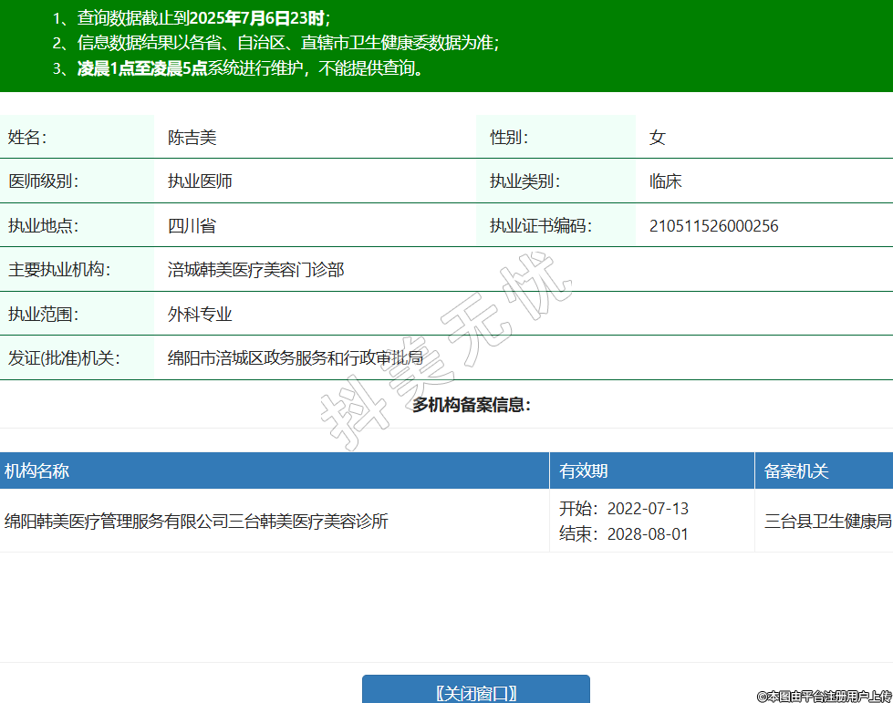 姓名:陳吉美性別:女醫(yī)師級別:執(zhí)業(yè)醫(yī)師執(zhí)業(yè)類別:臨床執(zhí)業(yè)地點(diǎn):四川省執(zhí)業(yè)證書編碼:210511526000256主要執(zhí)業(yè)機(jī)構(gòu):涪城韓美醫(yī)療美容門診部執(zhí)業(yè)范圍:外科專業(yè)發(fā)證(批準(zhǔn))機(jī)關(guān):綿陽市涪城區(qū)政務(wù)服務(wù)和行政審批局多機(jī)構(gòu)備案信息:機(jī)構(gòu)名稱 有效期 備案機(jī)關(guān) 綿陽韓美醫(yī)療管理服務(wù)有限公司三臺韓美醫(yī)療美容診所 開始:2022-07-13結(jié)束:2028-08-01三臺縣衛(wèi)生健康局 -