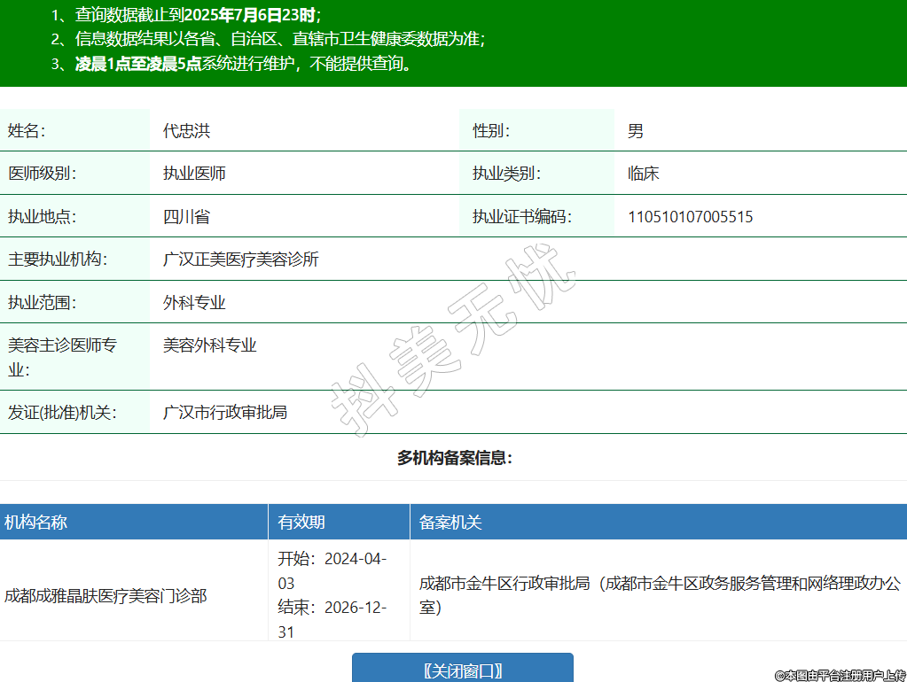 姓名:代忠洪性別:男醫(yī)師級(jí)別:執(zhí)業(yè)醫(yī)師執(zhí)業(yè)類別:臨床執(zhí)業(yè)地點(diǎn):四川省執(zhí)業(yè)證書編碼:110510107005515主要執(zhí)業(yè)機(jī)構(gòu):廣漢正美醫(yī)療美容診所執(zhí)業(yè)范圍:外科專業(yè)美容主診醫(yī)師專業(yè):美容外科專業(yè)發(fā)證(批準(zhǔn))機(jī)關(guān):廣漢市行政審批局多機(jī)構(gòu)備案信息:機(jī)構(gòu)名稱 有效期 備案機(jī)關(guān) 成都成雅晶膚醫(yī)療美容門診部 開始:2024-04-03結(jié)束:2026-12-31成都市金牛區(qū)行政審批局(成都市金牛區(qū)政務(wù)服務(wù)管理和網(wǎng)絡(luò)理政辦公室) 成都高新中美瑞辰綜合門診部 開始:2024-04-04結(jié)束:2026-12-31成都高新技術(shù)產(chǎn)業(yè)開發(fā)區(qū)衛(wèi)生健康局 成都青羊侑姿醫(yī)療美容門診部 開始:2024-04-09結(jié)束:2026-12-08成都市青羊區(qū)行政審批局(成都市青羊區(qū)政務(wù)服務(wù)管理和網(wǎng)絡(luò)理政辦公室) 華人醫(yī)聯(lián)整形美容醫(yī)院 開始:2024-04-15結(jié)束:2026-12-31成都市青羊區(qū)行政審批局(成都市青羊區(qū)政務(wù)服務(wù)管理和網(wǎng)絡(luò)理政辦公室) 成都高新熙之環(huán)亞醫(yī)療美容醫(yī)院 開始:2024-04-24結(jié)束:2026-12-31成都高新技術(shù)產(chǎn)業(yè)開發(fā)區(qū)衛(wèi)生健康局 成都武侯華生鉑悅美容醫(yī)院 開始:2024-05-15結(jié)束:2028-12-31成都市武侯區(qū)行政審批局 成都青羊華人醫(yī)聯(lián)為美醫(yī)療美容門診部 開始:2024-07-06結(jié)束:2027-12-31成都市青羊區(qū)行政審批局(成都市青羊區(qū)政務(wù)服務(wù)管理和網(wǎng)絡(luò)理政辦公室) 成都武侯圣形醫(yī)療美容門診部 開始:2024-08-21結(jié)束:2026-12-31成都市武侯區(qū)行政審批局 成都高新科賦麗爾醫(yī)療美容診所 開始:2024-10-22結(jié)束:2026-10-31成都高新技術(shù)產(chǎn)業(yè)開發(fā)區(qū)衛(wèi)生健康局 -