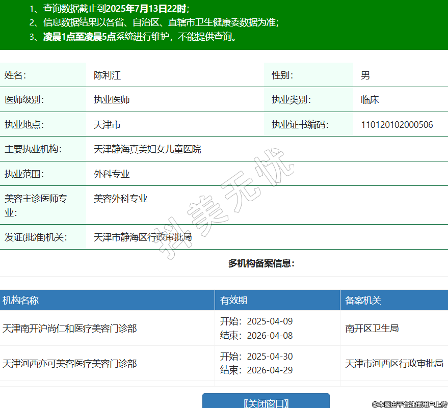 姓名:陳利江性別:男醫(yī)師級(jí)別:執(zhí)業(yè)醫(yī)師執(zhí)業(yè)類別:臨床執(zhí)業(yè)地點(diǎn):天津市執(zhí)業(yè)證書編碼:110120102000506主要執(zhí)業(yè)機(jī)構(gòu):天津靜海真美婦女兒童醫(yī)院執(zhí)業(yè)范圍:外科專業(yè)美容主診醫(yī)師專業(yè):美容外科專業(yè)發(fā)證(批準(zhǔn))機(jī)關(guān):天津市靜海區(qū)行政審批局多機(jī)構(gòu)備案信息:機(jī)構(gòu)名稱 有效期 備案機(jī)關(guān) 天津南開滬尚仁和醫(yī)療美容門診部 開始:2025-04-09結(jié)束:2026-04-08南開區(qū)衛(wèi)生局 天津河西亦可美客醫(yī)療美容門診部 開始:2025-04-30結(jié)束:2026-04-29天津市河西區(qū)行政審批局 天津美安心醫(yī)療美容門診部 開始:2025-05-16結(jié)束:2026-05-15濱海新區(qū)衛(wèi)生局 天津南開悅潼醫(yī)療美容診所 開始:2025-05-19結(jié)束:2026-05-18南開區(qū)衛(wèi)生局 天津南開赫泰佳顏醫(yī)療美容診所 開始:2025-05-27結(jié)束:2026-05-26南開區(qū)衛(wèi)生局 天津和平華美天顏醫(yī)療美容門診部 開始:2025-06-06結(jié)束:2026-06-05天津市和平區(qū)衛(wèi)生健康委員會(huì) 天津河?xùn)|星辰醫(yī)療美容診所 開始:2025-06-29結(jié)束:2026-06-28河?xùn)|區(qū)衛(wèi)生局 天津靜海瑞禾醫(yī)療美容診所 開始:2025-07-09結(jié)束:2026-07-08天津市靜海區(qū)行政審批局 -