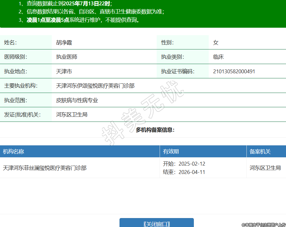 姓名:胡凈霞性別:女醫(yī)師級別:執(zhí)業(yè)醫(yī)師執(zhí)業(yè)類別:臨床執(zhí)業(yè)地點:天津市執(zhí)業(yè)證書編碼:210130582000491主要執(zhí)業(yè)機構:天津河東伊頌璽悅醫(yī)療美容門診部執(zhí)業(yè)范圍:皮膚病與性病專業(yè)發(fā)證(批準)機關:河東區(qū)衛(wèi)生局多機構備案信息:機構名稱 有效期 備案機關 天津河東菲絲瀾璽悅醫(yī)療美容門診部 開始:2025-02-12結束:2026-04-11河東區(qū)衛(wèi)生局 -