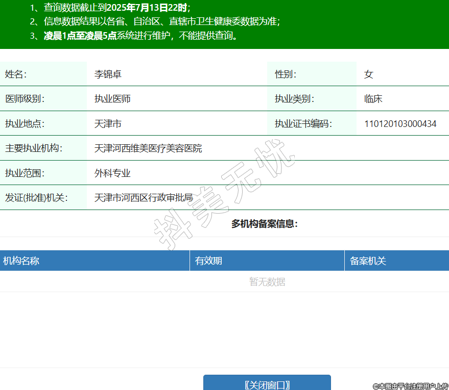 姓名:李錦卓性別:女醫(yī)師級(jí)別:執(zhí)業(yè)醫(yī)師執(zhí)業(yè)類別:臨床執(zhí)業(yè)地點(diǎn):天津市執(zhí)業(yè)證書(shū)編碼:110120103000434主要執(zhí)業(yè)機(jī)構(gòu):天津河西維美醫(yī)療美容醫(yī)院執(zhí)業(yè)范圍:外科專業(yè)發(fā)證(批準(zhǔn))機(jī)關(guān):天津市河西區(qū)行政審批局 -