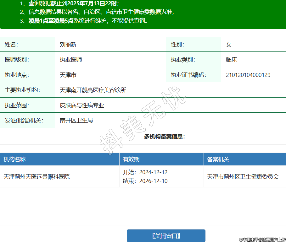 姓名:劉麗新性別:女醫(yī)師級(jí)別:執(zhí)業(yè)醫(yī)師執(zhí)業(yè)類(lèi)別:臨床執(zhí)業(yè)地點(diǎn):天津市執(zhí)業(yè)證書(shū)編碼:210120104000129主要執(zhí)業(yè)機(jī)構(gòu):天津南開(kāi)靚亮醫(yī)療美容診所執(zhí)業(yè)范圍:皮膚病與性病專(zhuān)業(yè)發(fā)證(批準(zhǔn))機(jī)關(guān):南開(kāi)區(qū)衛(wèi)生局多機(jī)構(gòu)備案信息:機(jī)構(gòu)名稱(chēng) 有效期 備案機(jī)關(guān) 天津薊州天醫(yī)遠(yuǎn)景眼科醫(yī)院 開(kāi)始:2024-12-12結(jié)束:2026-12-10天津市薊州區(qū)衛(wèi)生健康委員會(huì) -