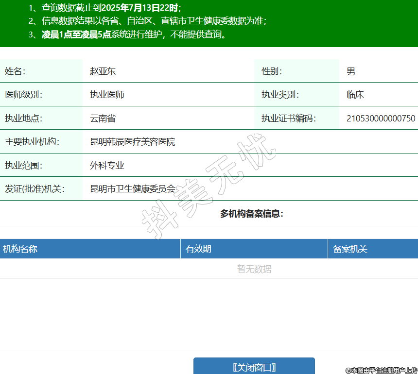 姓名:趙亞?wèn)|性別:男醫(yī)師級(jí)別:執(zhí)業(yè)醫(yī)師執(zhí)業(yè)類別:臨床執(zhí)業(yè)地點(diǎn):云南省執(zhí)業(yè)證書編碼:210530000000750主要執(zhí)業(yè)機(jī)構(gòu):昆明韓辰醫(yī)療美容醫(yī)院執(zhí)業(yè)范圍:外科專業(yè)發(fā)證(批準(zhǔn))機(jī)關(guān):昆明市衛(wèi)生健康委員會(huì) -