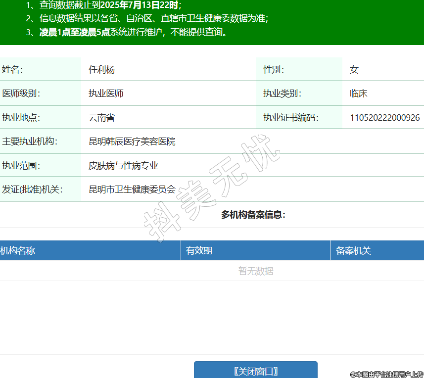 姓名:任利楊性別:女醫(yī)師級別:執(zhí)業(yè)醫(yī)師執(zhí)業(yè)類別:臨床執(zhí)業(yè)地點(diǎn):云南省執(zhí)業(yè)證書編碼:110520222000926主要執(zhí)業(yè)機(jī)構(gòu):昆明韓辰醫(yī)療美容醫(yī)院執(zhí)業(yè)范圍:皮膚病與性病專業(yè)發(fā)證(批準(zhǔn))機(jī)關(guān):昆明市衛(wèi)生健康委員會 -