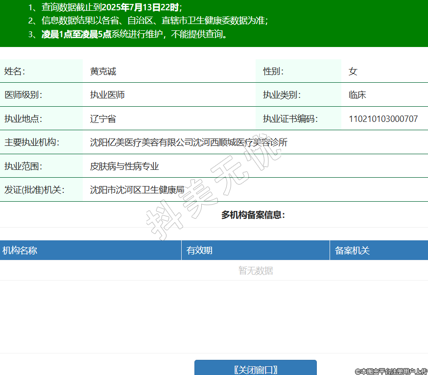 姓名:黃克誠(chéng)性別:女醫(yī)師級(jí)別:執(zhí)業(yè)醫(yī)師執(zhí)業(yè)類別:臨床執(zhí)業(yè)地點(diǎn):遼寧省執(zhí)業(yè)證書編碼:110210103000707主要執(zhí)業(yè)機(jī)構(gòu):沈陽億美醫(yī)療美容有限公司沈河西順城醫(yī)療美容診所執(zhí)業(yè)范圍:皮膚病與性病專業(yè)發(fā)證(批準(zhǔn))機(jī)關(guān):沈陽市沈河區(qū)衛(wèi)生健康局 -