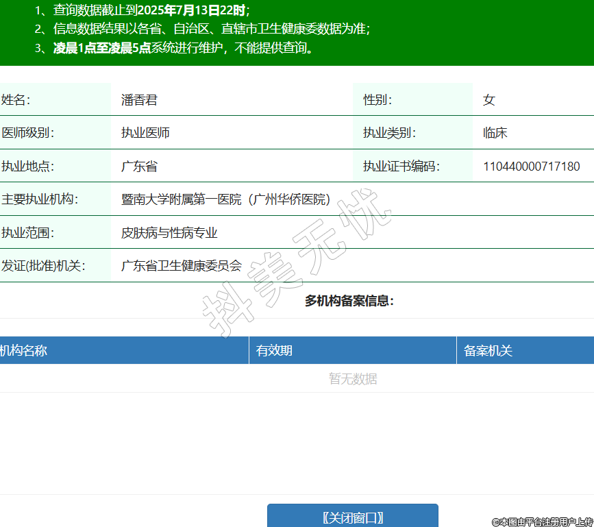 姓名:潘香君性別:女醫(yī)師級(jí)別:執(zhí)業(yè)醫(yī)師執(zhí)業(yè)類(lèi)別:臨床執(zhí)業(yè)地點(diǎn):廣東省執(zhí)業(yè)證書(shū)編碼:110440000717180主要執(zhí)業(yè)機(jī)構(gòu):暨南大學(xué)附屬第一醫(yī)院(廣州華僑醫(yī)院)執(zhí)業(yè)范圍:皮膚病與性病專(zhuān)業(yè)發(fā)證(批準(zhǔn))機(jī)關(guān):廣東省衛(wèi)生健康委員會(huì) -