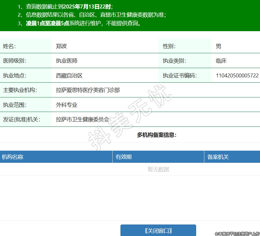 姓名:鄭波性別:男醫(yī)師級別:執(zhí)業(yè)醫(yī)師執(zhí)業(yè)類別:臨床執(zhí)業(yè)地點:西藏自治區(qū)執(zhí)業(yè)證書編碼:110420500005722主要執(zhí)業(yè)機構:拉薩愛思特醫(yī)療美容門診部執(zhí)業(yè)范圍:外科專業(yè)發(fā)證(批準)機關:拉薩市衛(wèi)生健康委員會 -