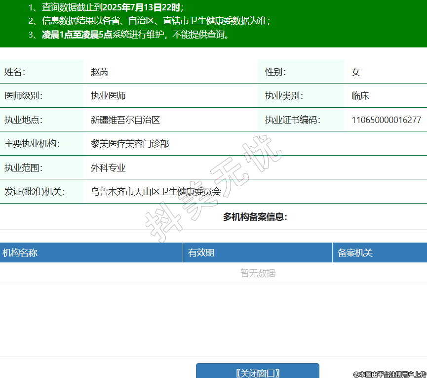 姓名:趙芮性別:女醫(yī)師級別:執(zhí)業(yè)醫(yī)師執(zhí)業(yè)類別:臨床執(zhí)業(yè)地點:新疆維吾爾自治區(qū)執(zhí)業(yè)證書編碼:110650000016277主要執(zhí)業(yè)機構:黎美醫(yī)療美容門診部執(zhí)業(yè)范圍:外科專業(yè)發(fā)證(批準)機關:烏魯木齊市天山區(qū)衛(wèi)生健康委員會 -