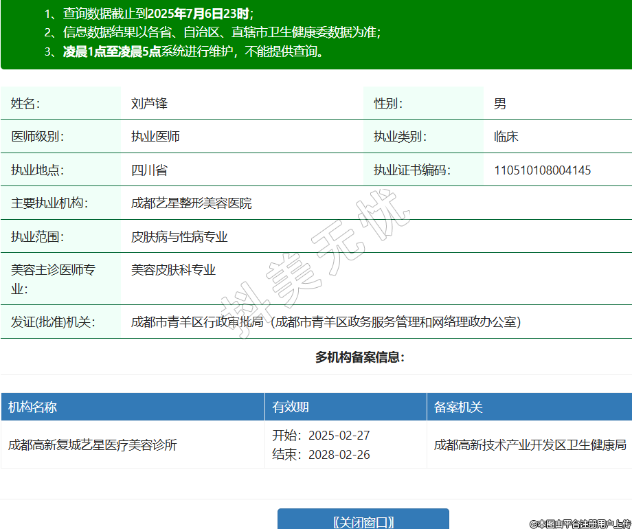 姓名:劉蘆鋒性別:男醫(yī)師級(jí)別:執(zhí)業(yè)醫(yī)師執(zhí)業(yè)類別:臨床執(zhí)業(yè)地點(diǎn):四川省執(zhí)業(yè)證書(shū)編碼:110510108004145主要執(zhí)業(yè)機(jī)構(gòu):成都藝星整形美容醫(yī)院執(zhí)業(yè)范圍:皮膚病與性病專業(yè)美容主診醫(yī)師專業(yè):美容皮膚科專業(yè)發(fā)證(批準(zhǔn))機(jī)關(guān):成都市青羊區(qū)行政審批局(成都市青羊區(qū)政務(wù)服務(wù)管理和網(wǎng)絡(luò)理政辦公室)多機(jī)構(gòu)備案信息:機(jī)構(gòu)名稱 有效期 備案機(jī)關(guān) 成都高新復(fù)城藝星醫(yī)療美容診所 開(kāi)始:2025-02-27結(jié)束:2028-02-26成都高新技術(shù)產(chǎn)業(yè)開(kāi)發(fā)區(qū)衛(wèi)生健康局 -