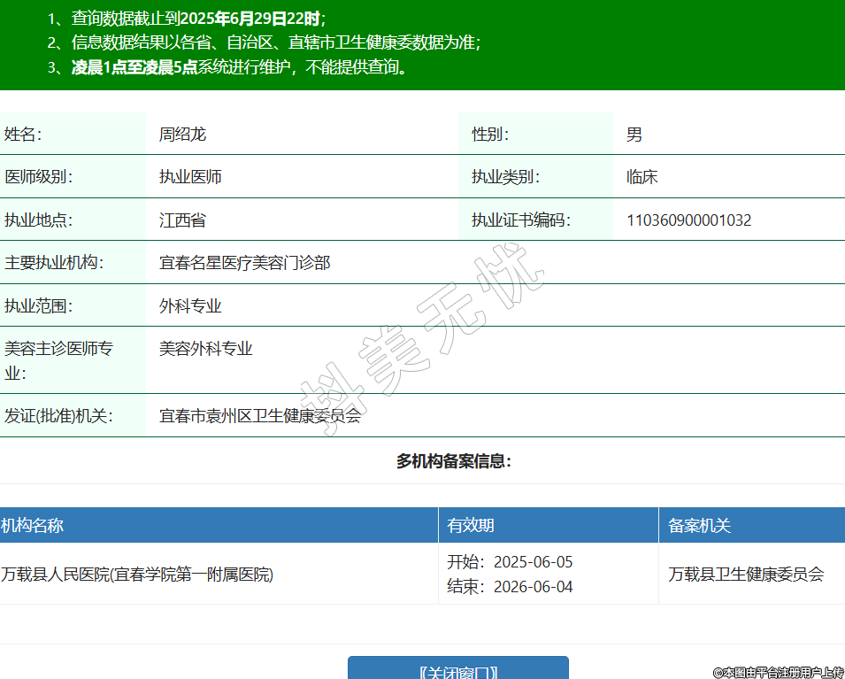 姓名:周紹龍性別:男醫(yī)師級(jí)別:執(zhí)業(yè)醫(yī)師執(zhí)業(yè)類別:臨床執(zhí)業(yè)地點(diǎn):江西省執(zhí)業(yè)證書(shū)編碼:110360900001032主要執(zhí)業(yè)機(jī)構(gòu):宜春名星醫(yī)療美容門診部執(zhí)業(yè)范圍:外科專業(yè)美容主診醫(yī)師專業(yè):美容外科專業(yè)發(fā)證(批準(zhǔn))機(jī)關(guān):宜春市袁州區(qū)衛(wèi)生健康委員會(huì)多機(jī)構(gòu)備案信息:機(jī)構(gòu)名稱 有效期 備案機(jī)關(guān) 萬(wàn)載縣人民醫(yī)院(宜春學(xué)院第一附屬醫(yī)院) 開(kāi)始:2025-06-05結(jié)束:2026-06-04萬(wàn)載縣衛(wèi)生健康委員會(huì) -