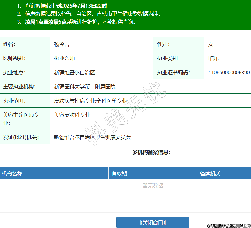 姓名:楊今言性別:女醫(yī)師級(jí)別:執(zhí)業(yè)醫(yī)師執(zhí)業(yè)類別:臨床執(zhí)業(yè)地點(diǎn):新疆維吾爾自治區(qū)執(zhí)業(yè)證書編碼:110650000006390主要執(zhí)業(yè)機(jī)構(gòu):新疆醫(yī)科大學(xué)第二附屬醫(yī)院執(zhí)業(yè)范圍:皮膚病與性病專業(yè);全科醫(yī)學(xué)專業(yè)美容主診醫(yī)師專業(yè):美容皮膚科專業(yè)發(fā)證(批準(zhǔn))機(jī)關(guān):新疆維吾爾自治區(qū)衛(wèi)生健康委員會(huì) -