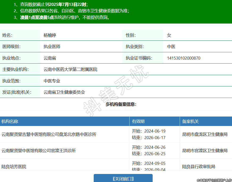 姓名:楊榆婷性別:女醫(yī)師級別:執(zhí)業(yè)醫(yī)師執(zhí)業(yè)類別:中醫(yī)執(zhí)業(yè)地點:云南省執(zhí)業(yè)證書編碼:141530102000870主要執(zhí)業(yè)機構(gòu):云南中醫(yī)藥大學第二附屬醫(yī)院執(zhí)業(yè)范圍:中醫(yī)專業(yè)發(fā)證(批準)機關(guān):云南省衛(wèi)生健康委員會多機構(gòu)備案信息:機構(gòu)名稱 有效期 備案機關(guān) 云南聚賢堂吉慧中醫(yī)館有限公司盤龍北京路中醫(yī)診所 開始:2024-06-19結(jié)束:2026-06-17昆明市盤龍區(qū)衛(wèi)生健康局 云南聚賢堂中醫(yī)館有限公司官渡王洪診所 開始:2024-06-26結(jié)束:2026-06-25昆明市官渡區(qū)衛(wèi)生健康局 陸良培芳醫(yī)院 開始:2024-09-05結(jié)束:2026-09-04陸良縣行政審批局 -