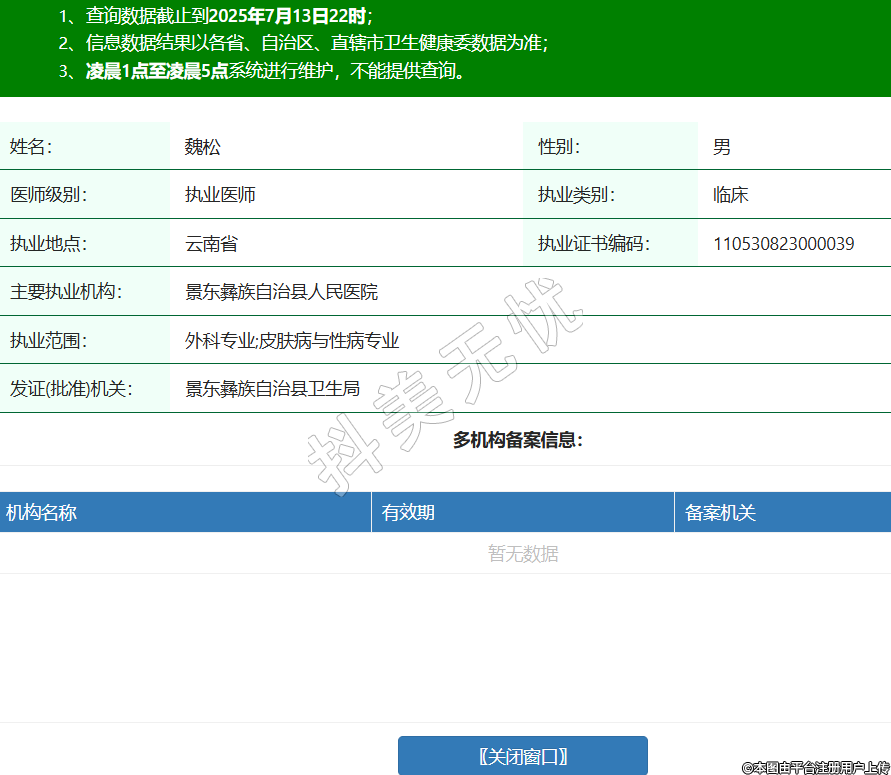 姓名:魏松性別:男醫(yī)師級(jí)別:執(zhí)業(yè)醫(yī)師執(zhí)業(yè)類別:臨床執(zhí)業(yè)地點(diǎn):云南省執(zhí)業(yè)證書編碼:110530823000039主要執(zhí)業(yè)機(jī)構(gòu):景東彝族自治縣人民醫(yī)院執(zhí)業(yè)范圍:外科專業(yè);皮膚病與性病專業(yè)發(fā)證(批準(zhǔn))機(jī)關(guān):景東彝族自治縣衛(wèi)生局 -