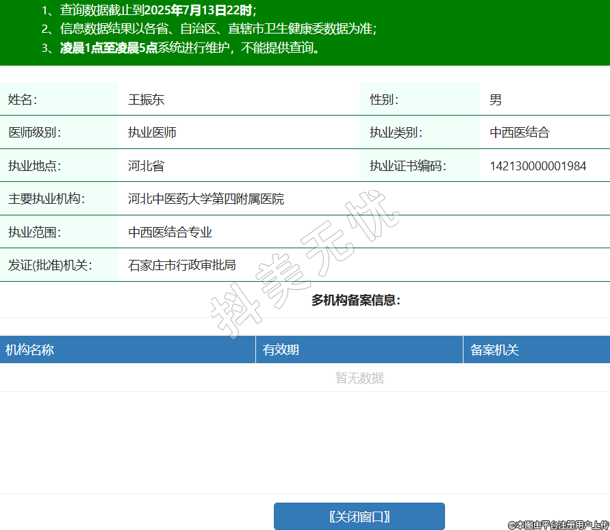 姓名:王振東性別:男醫(yī)師級別:執(zhí)業(yè)醫(yī)師執(zhí)業(yè)類別:中西醫(yī)結(jié)合執(zhí)業(yè)地點(diǎn):河北省執(zhí)業(yè)證書編碼:142130000001984主要執(zhí)業(yè)機(jī)構(gòu):河北中醫(yī)藥大學(xué)第四附屬醫(yī)院執(zhí)業(yè)范圍:中西醫(yī)結(jié)合專業(yè)發(fā)證(批準(zhǔn))機(jī)關(guān):石家莊市行政審批局 -