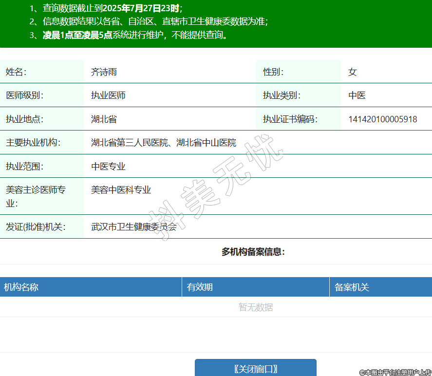 姓名:齊詩(shī)雨性別:女醫(yī)師級(jí)別:執(zhí)業(yè)醫(yī)師執(zhí)業(yè)類(lèi)別:中醫(yī)執(zhí)業(yè)地點(diǎn):湖北省執(zhí)業(yè)證書(shū)編碼:141420100005918主要執(zhí)業(yè)機(jī)構(gòu):湖北省第三人民醫(yī)院、湖北省中山醫(yī)院執(zhí)業(yè)范圍:中醫(yī)專(zhuān)業(yè)美容主診醫(yī)師專(zhuān)業(yè):美容中醫(yī)科專(zhuān)業(yè)發(fā)證(批準(zhǔn))機(jī)關(guān):武漢市衛(wèi)生健康委員會(huì) -