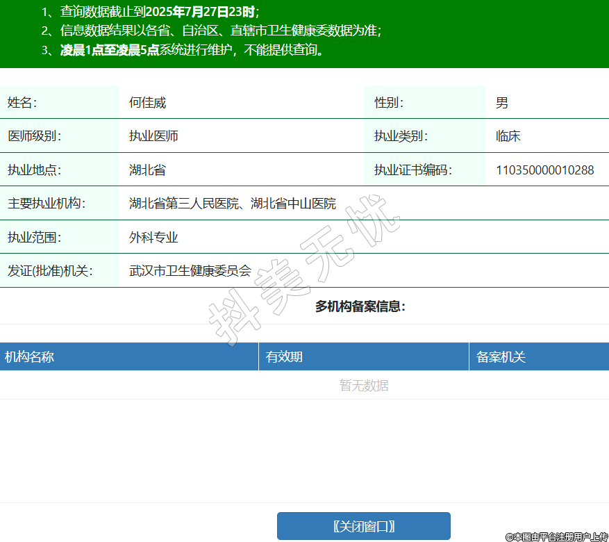 姓名:何佳威性別:男醫(yī)師級(jí)別:執(zhí)業(yè)醫(yī)師執(zhí)業(yè)類別:臨床執(zhí)業(yè)地點(diǎn):湖北省執(zhí)業(yè)證書(shū)編碼:110350000010288主要執(zhí)業(yè)機(jī)構(gòu):湖北省第三人民醫(yī)院、湖北省中山醫(yī)院執(zhí)業(yè)范圍:外科專業(yè)發(fā)證(批準(zhǔn))機(jī)關(guān):武漢市衛(wèi)生健康委員會(huì) -