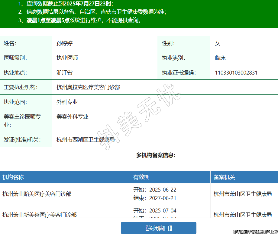 姓名:孫婷婷性別:女醫(yī)師級別:執(zhí)業(yè)醫(yī)師執(zhí)業(yè)類別:臨床執(zhí)業(yè)地點:浙江省執(zhí)業(yè)證書編碼:110330103002831主要執(zhí)業(yè)機構(gòu):杭州奧拉克醫(yī)療美容門診部執(zhí)業(yè)范圍:外科專業(yè)美容主診醫(yī)師專業(yè):美容外科專業(yè)發(fā)證(批準)機關(guān):杭州市西湖區(qū)衛(wèi)生健康局多機構(gòu)備案信息:機構(gòu)名稱 有效期 備案機關(guān) 杭州蕭山貽美醫(yī)療美容門診部 開始:2025-06-22結(jié)束:2027-06-21杭州市蕭山區(qū)衛(wèi)生健康局 杭州蕭山新美薈醫(yī)療美容門診部 開始:2025-07-04結(jié)束:2026-07-03杭州市蕭山區(qū)衛(wèi)生健康局 -