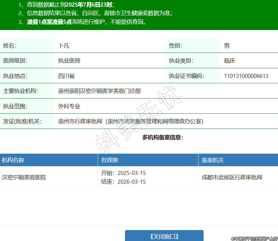 姓名:卜凡性別:男醫(yī)師級別:執(zhí)業(yè)醫(yī)師執(zhí)業(yè)類別:臨床執(zhí)業(yè)地點:四川省執(zhí)業(yè)證書編碼:110131000006613主要執(zhí)業(yè)機構(gòu):崇州崇陽漢密爾頓醫(yī)學(xué)美容門診部執(zhí)業(yè)范圍:外科專業(yè)發(fā)證(批準)機關(guān):崇州市行政審批局(崇州市政務(wù)服務(wù)管理和網(wǎng)絡(luò)理政辦公室)多機構(gòu)備案信息:機構(gòu)名稱 有效期 備案機關(guān) 漢密爾頓美容醫(yī)院 開始:2025-03-15結(jié)束:2026-03-15成都市武侯區(qū)行政審批局 -