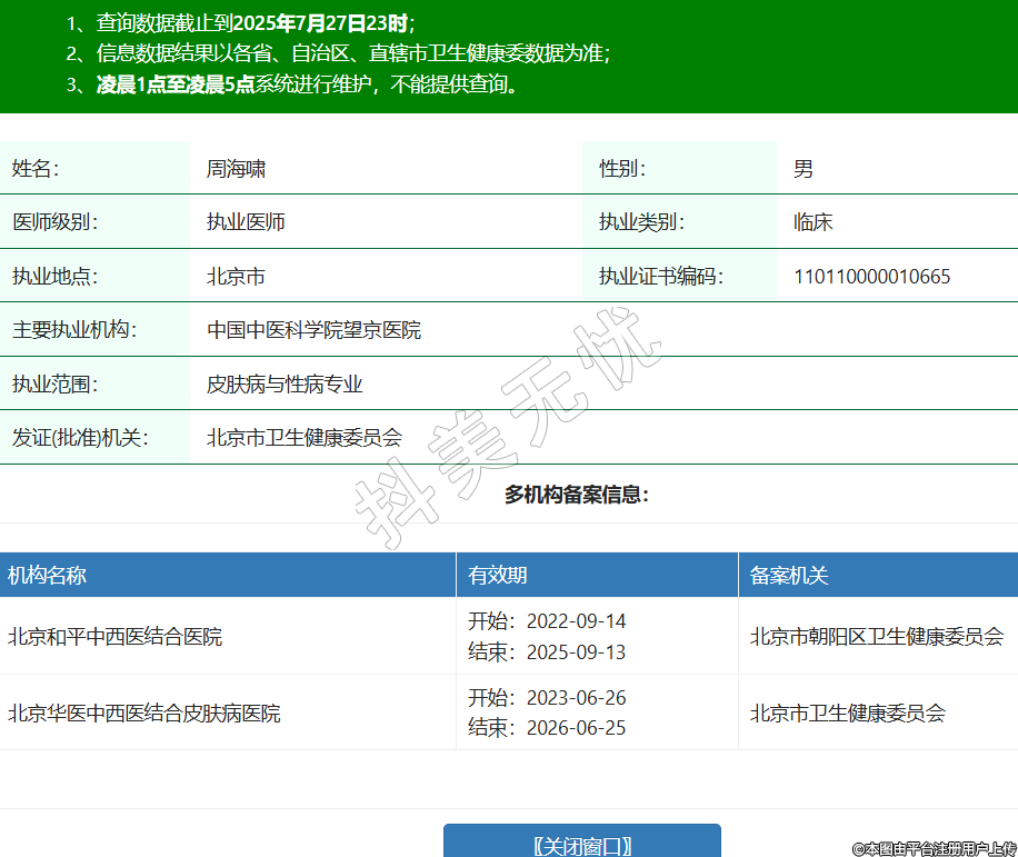 姓名:周海嘯性別:男醫(yī)師級別:執(zhí)業(yè)醫(yī)師執(zhí)業(yè)類別:臨床執(zhí)業(yè)地點:北京市執(zhí)業(yè)證書編碼:110110000010665主要執(zhí)業(yè)機構(gòu):中國中醫(yī)科學院望京醫(yī)院執(zhí)業(yè)范圍:皮膚病與性病專業(yè)發(fā)證(批準)機關(guān):北京市衛(wèi)生健康委員會多機構(gòu)備案信息:機構(gòu)名稱 有效期 備案機關(guān) 北京和平中西醫(yī)結(jié)合醫(yī)院 開始:2022-09-14結(jié)束:2025-09-13北京市朝陽區(qū)衛(wèi)生健康委員會 北京華醫(yī)中西醫(yī)結(jié)合皮膚病醫(yī)院 開始:2023-06-26結(jié)束:2026-06-25北京市衛(wèi)生健康委員會 -