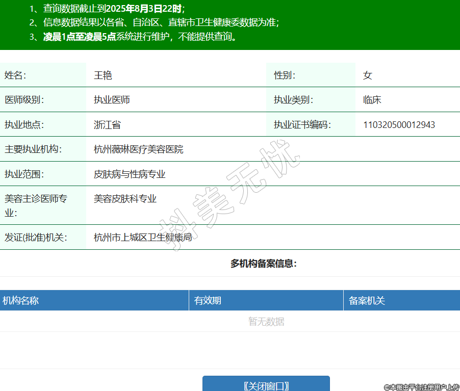 姓名:王艷性別:女醫(yī)師級(jí)別:執(zhí)業(yè)醫(yī)師執(zhí)業(yè)類(lèi)別:臨床執(zhí)業(yè)地點(diǎn):浙江省執(zhí)業(yè)證書(shū)編碼:110320500012943主要執(zhí)業(yè)機(jī)構(gòu):杭州薇琳醫(yī)療美容醫(yī)院執(zhí)業(yè)范圍:皮膚病與性病專(zhuān)業(yè)美容主診醫(yī)師專(zhuān)業(yè):美容皮膚科專(zhuān)業(yè)發(fā)證(批準(zhǔn))機(jī)關(guān):杭州市上城區(qū)衛(wèi)生健康局 -