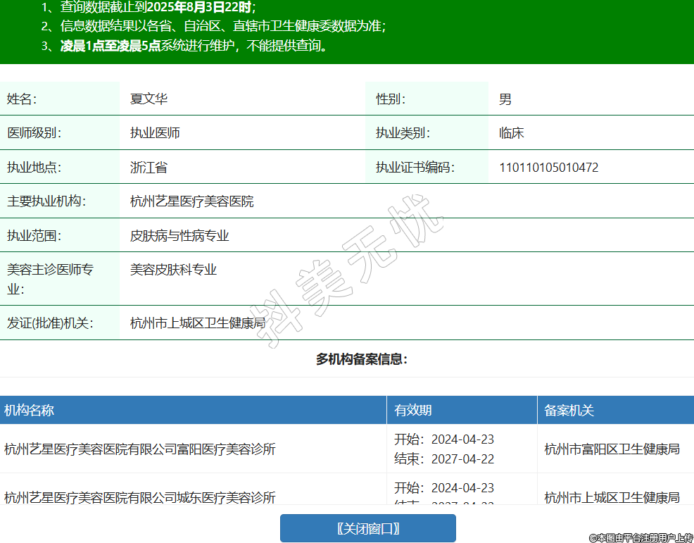姓名:夏文華性別:男醫(yī)師級(jí)別:執(zhí)業(yè)醫(yī)師執(zhí)業(yè)類別:臨床執(zhí)業(yè)地點(diǎn):浙江省執(zhí)業(yè)證書編碼:110110105010472主要執(zhí)業(yè)機(jī)構(gòu):杭州藝星醫(yī)療美容醫(yī)院執(zhí)業(yè)范圍:皮膚病與性病專業(yè)美容主診醫(yī)師專業(yè):美容皮膚科專業(yè)發(fā)證(批準(zhǔn))機(jī)關(guān):杭州市上城區(qū)衛(wèi)生健康局多機(jī)構(gòu)備案信息:機(jī)構(gòu)名稱 有效期 備案機(jī)關(guān) 杭州藝星醫(yī)療美容醫(yī)院有限公司富陽(yáng)醫(yī)療美容診所 開(kāi)始:2024-04-23結(jié)束:2027-04-22杭州市富陽(yáng)區(qū)衛(wèi)生健康局 杭州藝星醫(yī)療美容醫(yī)院有限公司城東醫(yī)療美容診所 開(kāi)始:2024-04-23結(jié)束:2027-04-22杭州市上城區(qū)衛(wèi)生健康局 杭州藝星醫(yī)療美容醫(yī)院有限公司城西醫(yī)療美容門診部 開(kāi)始:2024-04-23結(jié)束:2027-04-22杭州市西湖區(qū)衛(wèi)生健康局 杭州藝星醫(yī)療美容醫(yī)院有限公司余杭醫(yī)療美容診所 開(kāi)始:2025-01-08結(jié)束:2028-01-07杭州市余杭區(qū)衛(wèi)生健康局 -