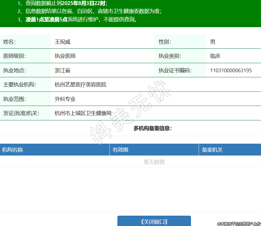 姓名:王祝威性別:男醫(yī)師級別:執(zhí)業(yè)醫(yī)師執(zhí)業(yè)類別:臨床執(zhí)業(yè)地點:浙江省執(zhí)業(yè)證書編碼:110310000063195主要執(zhí)業(yè)機構:杭州藝星醫(yī)療美容醫(yī)院執(zhí)業(yè)范圍:外科專業(yè)發(fā)證(批準)機關:杭州市上城區(qū)衛(wèi)生健康局 -