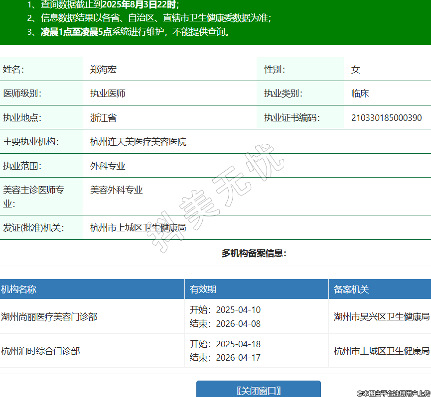 姓名:鄭海宏性別:女醫(yī)師級(jí)別:執(zhí)業(yè)醫(yī)師執(zhí)業(yè)類別:臨床執(zhí)業(yè)地點(diǎn):浙江省執(zhí)業(yè)證書(shū)編碼:210330185000390主要執(zhí)業(yè)機(jī)構(gòu):杭州連天美醫(yī)療美容醫(yī)院執(zhí)業(yè)范圍:外科專業(yè)美容主診醫(yī)師專業(yè):美容外科專業(yè)發(fā)證(批準(zhǔn))機(jī)關(guān):杭州市上城區(qū)衛(wèi)生健康局多機(jī)構(gòu)備案信息:機(jī)構(gòu)名稱 有效期 備案機(jī)關(guān) 湖州尚麗醫(yī)療美容門(mén)診部 開(kāi)始:2025-04-10結(jié)束:2026-04-08湖州市吳興區(qū)衛(wèi)生健康局 杭州泊時(shí)綜合門(mén)診部 開(kāi)始:2025-04-18結(jié)束:2026-04-17杭州市上城區(qū)衛(wèi)生健康局 -