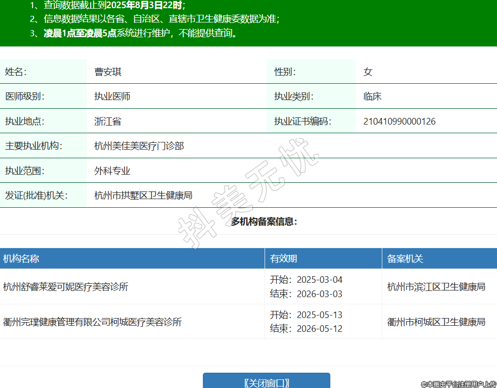 姓名:曹安琪性別:女醫(yī)師級別:執(zhí)業(yè)醫(yī)師執(zhí)業(yè)類別:臨床執(zhí)業(yè)地點:浙江省執(zhí)業(yè)證書編碼:210410990000126主要執(zhí)業(yè)機構(gòu):杭州美佳美醫(yī)療門診部執(zhí)業(yè)范圍:外科專業(yè)發(fā)證(批準)機關(guān):杭州市拱墅區(qū)衛(wèi)生健康局多機構(gòu)備案信息:機構(gòu)名稱 有效期 備案機關(guān) 杭州舒睿萊愛可妮醫(yī)療美容診所 開始:2025-03-04結(jié)束:2026-03-03杭州市濱江區(qū)衛(wèi)生健康局 衢州完璞健康管理有限公司柯城醫(yī)療美容診所 開始:2025-05-13結(jié)束:2026-05-12衢州市柯城區(qū)衛(wèi)生健康局 -
