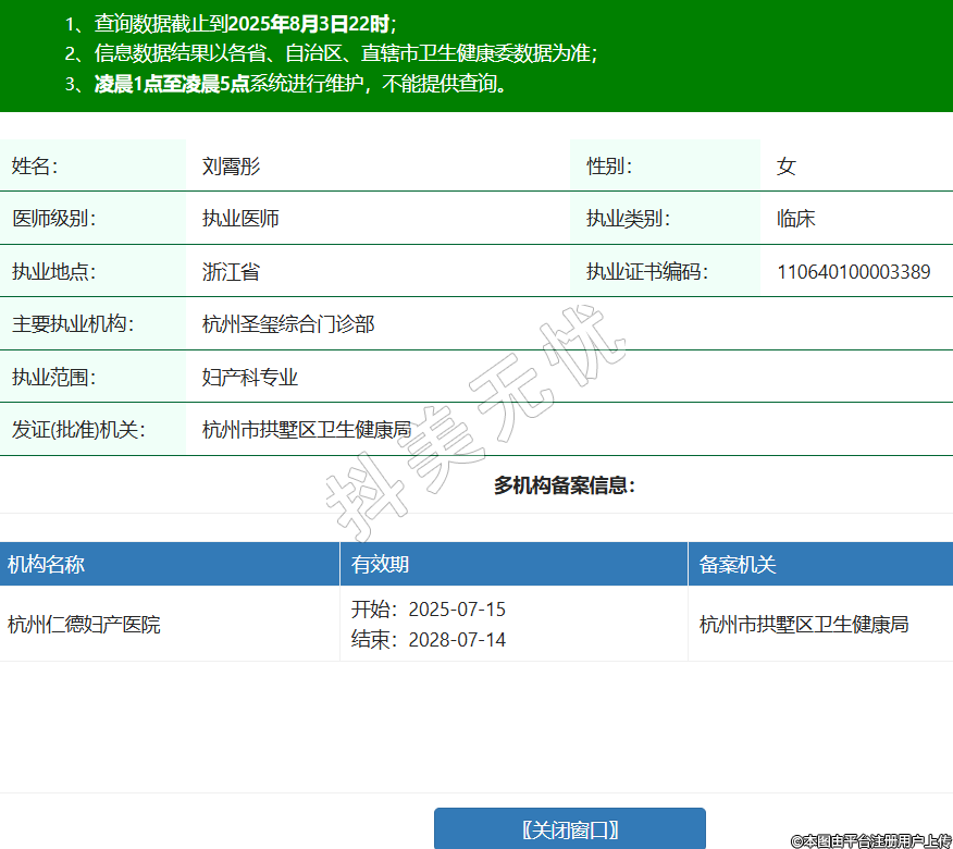姓名:劉霄彤性別:女醫(yī)師級(jí)別:執(zhí)業(yè)醫(yī)師執(zhí)業(yè)類別:臨床執(zhí)業(yè)地點(diǎn):浙江省執(zhí)業(yè)證書編碼:110640100003389主要執(zhí)業(yè)機(jī)構(gòu):杭州圣璽綜合門診部執(zhí)業(yè)范圍:婦產(chǎn)科專業(yè)發(fā)證(批準(zhǔn))機(jī)關(guān):杭州市拱墅區(qū)衛(wèi)生健康局多機(jī)構(gòu)備案信息:機(jī)構(gòu)名稱 有效期 備案機(jī)關(guān) 杭州仁德婦產(chǎn)醫(yī)院 開(kāi)始:2025-07-15結(jié)束:2028-07-14杭州市拱墅區(qū)衛(wèi)生健康局 -