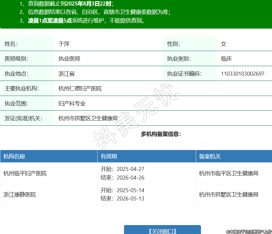 姓名:于萍性別:女醫(yī)師級(jí)別:執(zhí)業(yè)醫(yī)師執(zhí)業(yè)類別:臨床執(zhí)業(yè)地點(diǎn):浙江省執(zhí)業(yè)證書編碼:110330103002697主要執(zhí)業(yè)機(jī)構(gòu):杭州仁德婦產(chǎn)醫(yī)院執(zhí)業(yè)范圍:婦產(chǎn)科專業(yè)發(fā)證(批準(zhǔn))機(jī)關(guān):杭州市拱墅區(qū)衛(wèi)生健康局多機(jī)構(gòu)備案信息:機(jī)構(gòu)名稱 有效期 備案機(jī)關(guān) 杭州臨平婦產(chǎn)醫(yī)院 開(kāi)始:2025-04-27結(jié)束:2026-04-26杭州市臨平區(qū)衛(wèi)生健康局 浙江康靜醫(yī)院 開(kāi)始:2025-05-14結(jié)束:2026-05-13杭州市拱墅區(qū)衛(wèi)生健康局 -